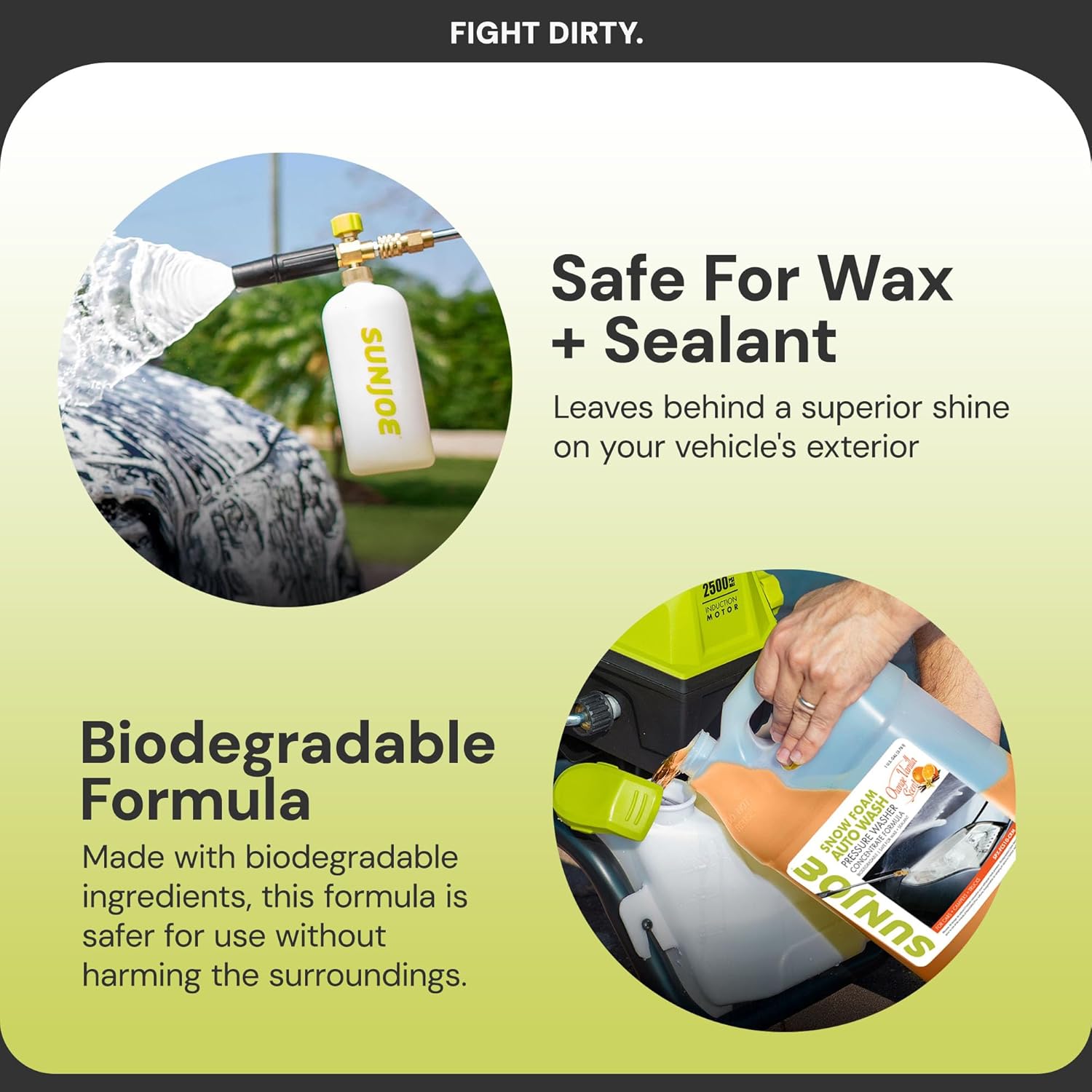 FIGHT DIRTY. Give your auto cleaning blast a boost with the NEW sweet scent of ORANGE-VANILLA! This fast-foaming, high-viscosity snow foam auto wash is specially formulated to capture and gently rinse away dirt particles on your vehicle’s exterior to leave behind a superior shine. Gentle on paintwork, tough on road grime. For best results, use with a pressure washer foam cannon attachment (SUN JOE SPX-FC34) for maximum foaming action, and rinse to reveal a clean, brilliant finish. Made for use with pressure washers.